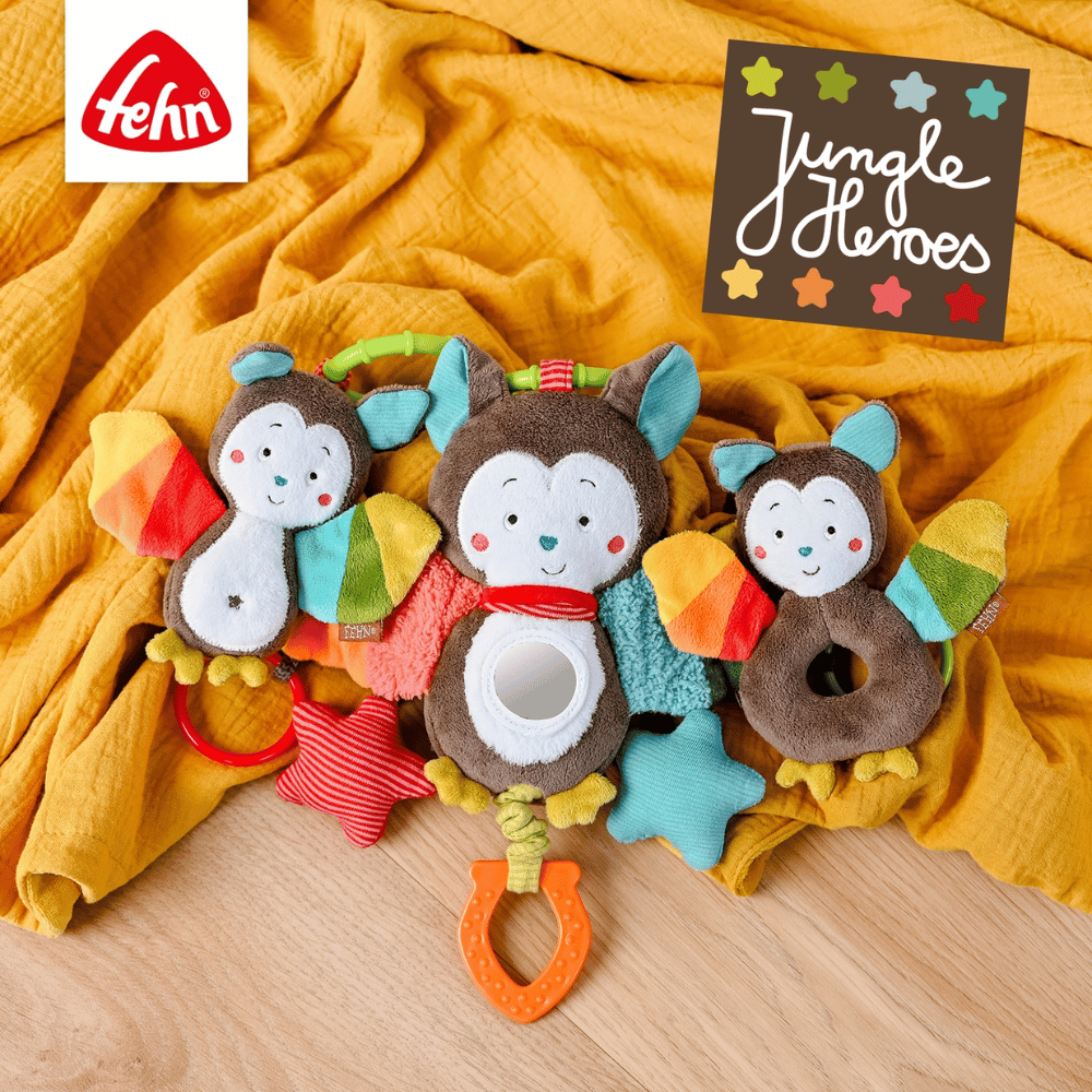 De mix van zachte materialen zoals velours, pluche, bouclette en corduroy nodigt uit tot knuffelen, grijpen en ontdekken – een echte alleskunner in één compact speeltje!