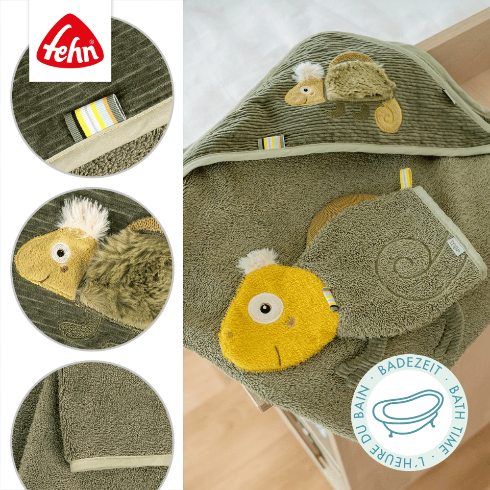 Of het nu na een warm badje is, een plons in het zwembad of een dagje strand: met de zachte babyhanddoek met capuchon en kameleonapplicatie uit de Kameleon-, Luiaard- en Flamingo-collectie blijft je kleintje heerlijk warm en beschermd tegen tocht en kou.