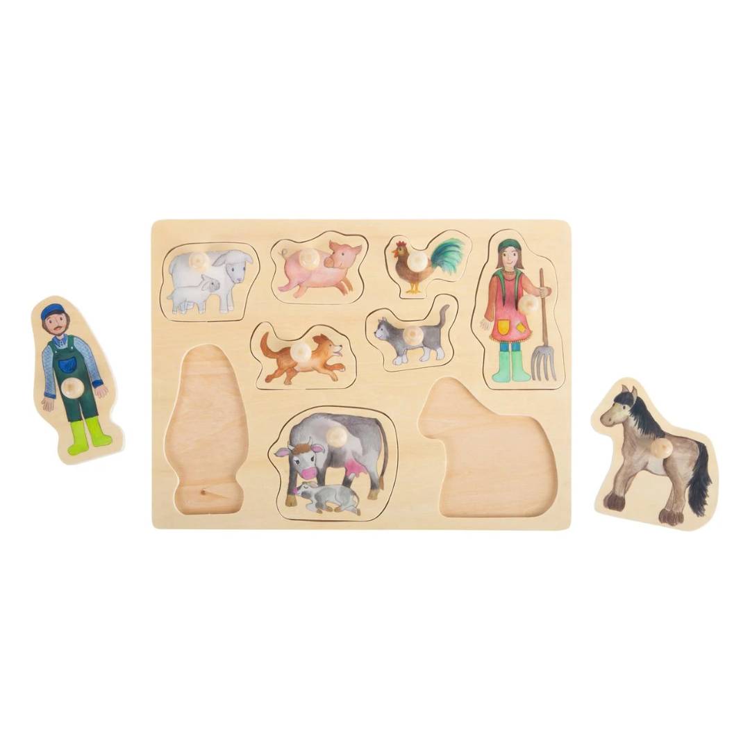 Een bezoek aan de boerderij! Deze robuuste houten legpuzzel bevat liefdevol geïllustreerde puzzelstukjes met houten knoppen uit de themawereld Farm & Country Life. Dankzij de stevige knoppen zijn de puzzelstukken eenvoudig vast te pakken door kleine kinderhanden en passen ze gemakkelijk in de vormen op de puzzelplaat.