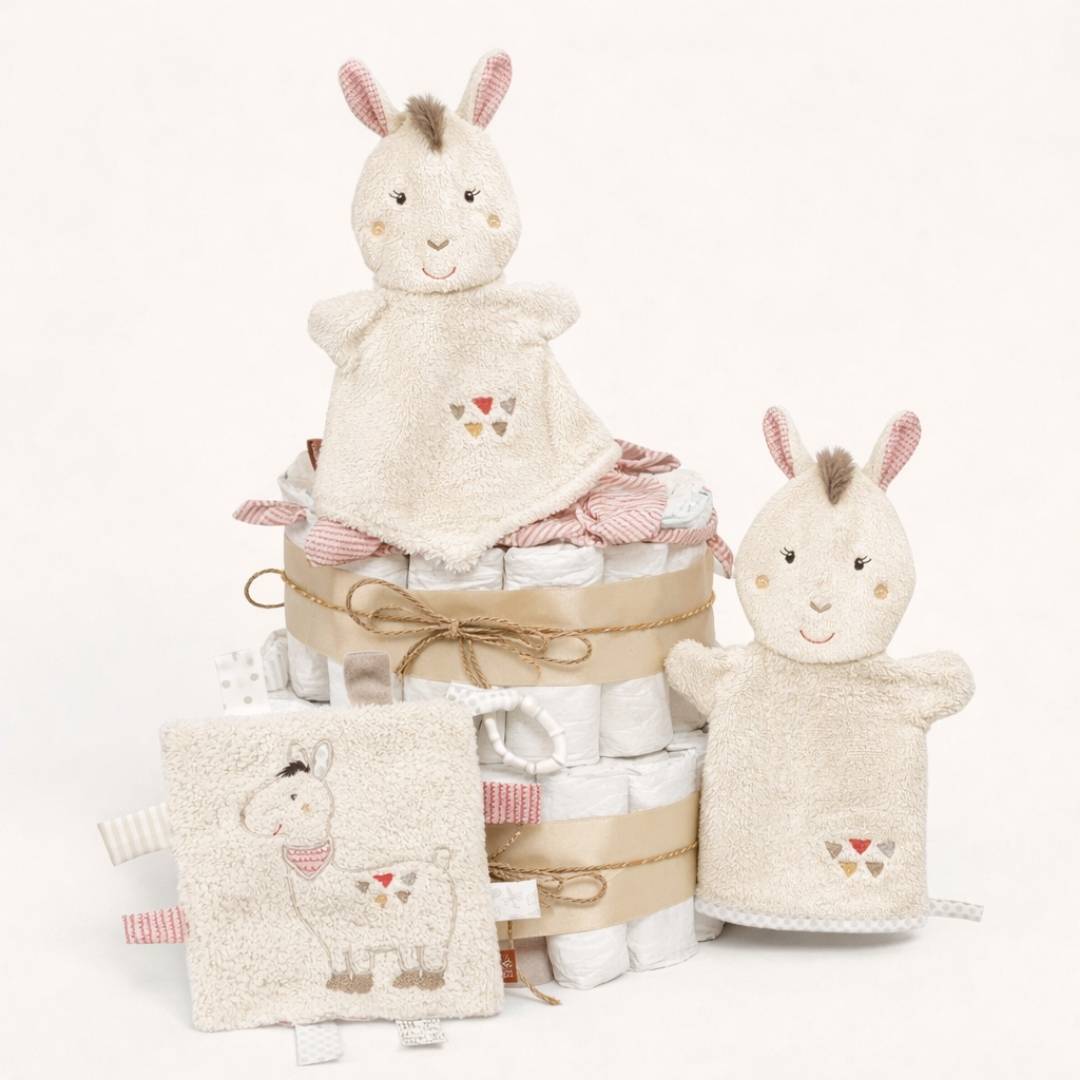De Luiertaart – Lama is een prachtig kraamcadeau voor een baby die op haar of zijn eigen manier de wereld mag ontdekken. Lief, zacht en een tikkeltje eigenwijs — precies zoals het hoort.