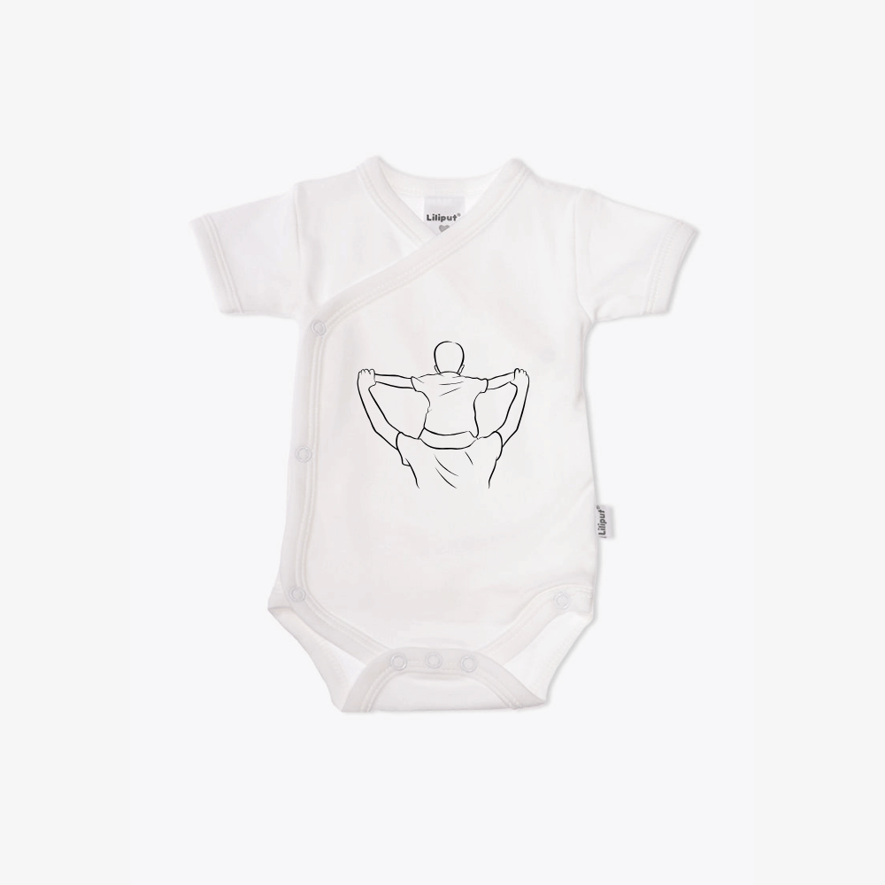 Dit comfortabele, witte overslagrompertje met een mooie opdruk van papa en kind op schouders is perfect voor de allerkleinsten. Ideaal als kraamcadeau of om je eigen baby iets bijzonders aan te trekken.