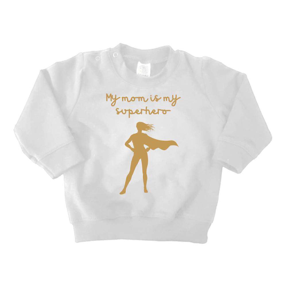 Op zoek naar een uniek en veilige sweater voor je kleintje of als origineel kraamcadeau of verjaardagscadeau? Deze zachte sweater met een mooie tekst ‘My mom is my superhero’ uit de SuperFam collectie is niet alleen comfortabel, maar ook een echte eyecatcher!