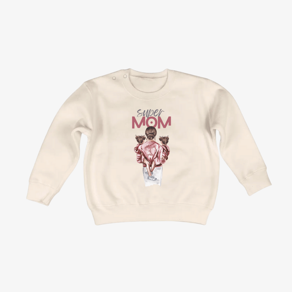 Op zoek naar een uniek en veilige sweater voor je kleintje of als origineel kraamcadeau? Deze zachte sweater met een mooie opdruk van moeder met dochters en tekst ‘super mom’ is niet alleen comfortabel, maar ook een echte eyecatcher!