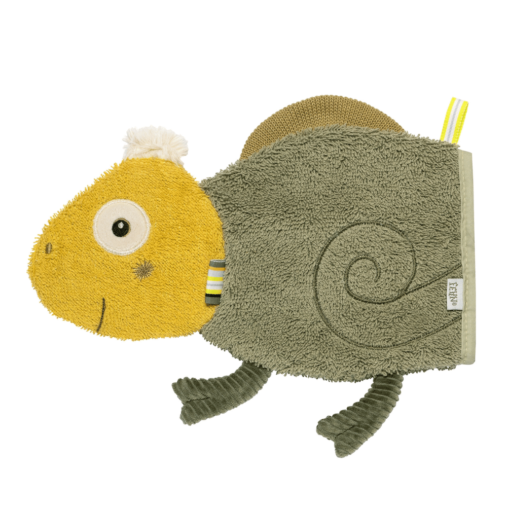 Deze multifunctionele washand is niet alleen perfect voor het zacht reinigen van de tere babyhuid, maar kan ook gebruikt worden als handpop. Zo komt de kleurrijke kameleon tot leven en zorgt hij voor een glimlach op elk gezicht – of het nu in bad is, aan de wastafel of tijdens het spelen.