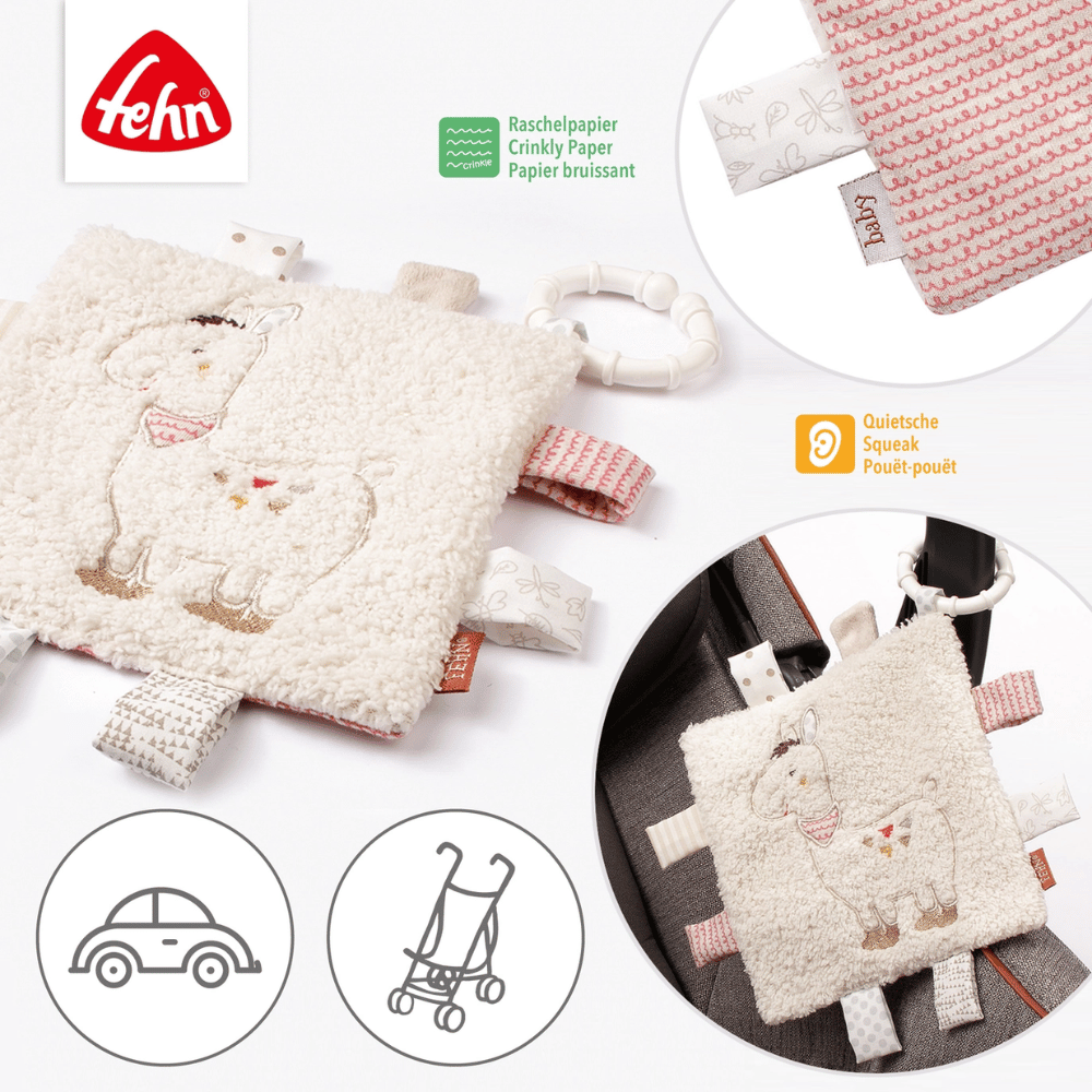 Met zijn praktische bevestigingsring kan deze zachte activiteitendoek lama eenvoudig worden vastgemaakt aan kinderwagen, babyzitje of bed – perfect voor kleine ontdekkingsreizigers. De verschillende speelfuncties zoals ritselpapier, pieper en grijpelementen zorgen voor afwisseling, stimuleren de tastzin en ondersteunen de fijne motoriek van je baby.