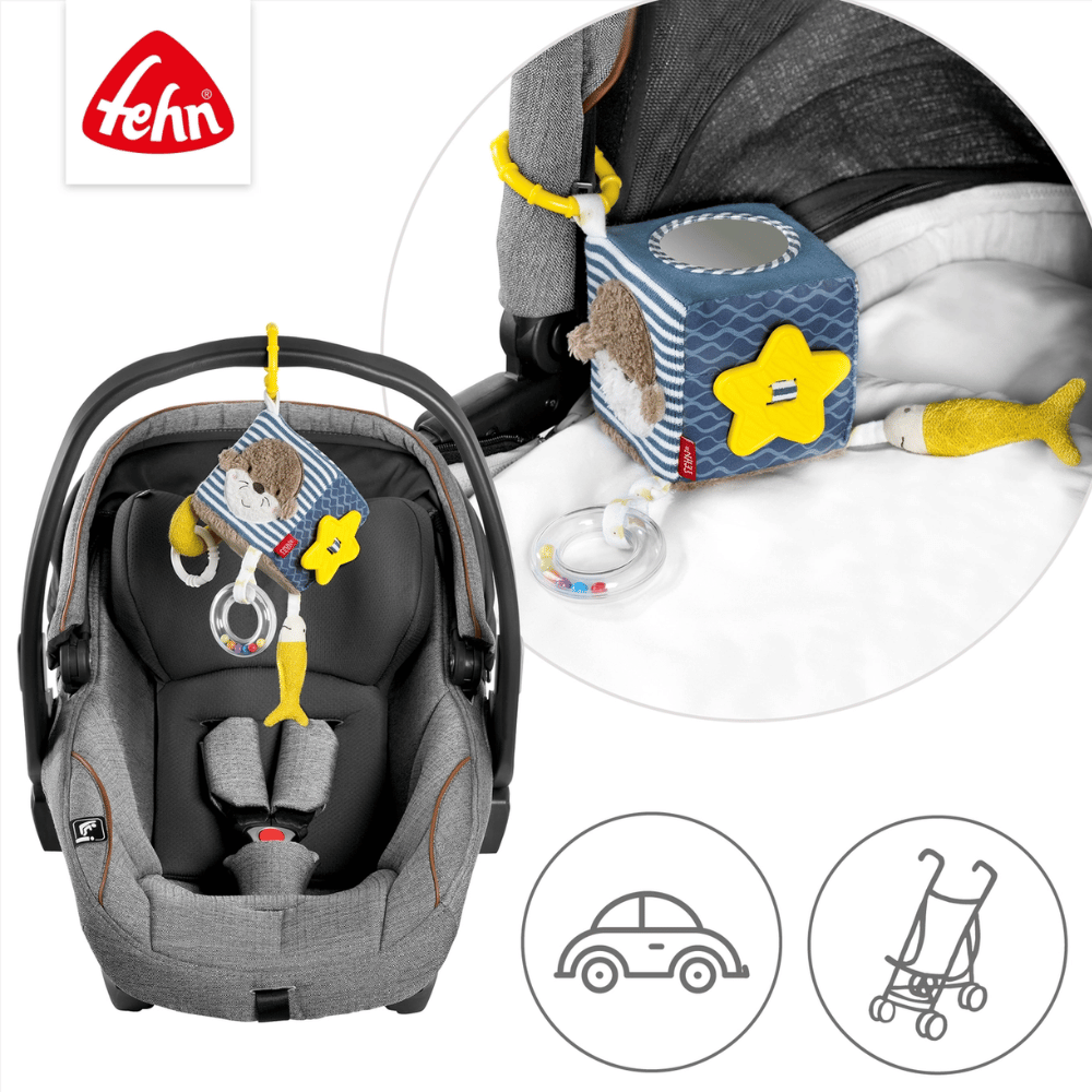 De kubus beschikt over een prachtige mix van materialen en diverse speelelementen, waaronder een rammelaar, grijpringen, belletje, spiegeltje, bijtelementen en ritselend papier. Dit zorgt voor afwisseling in tast, geluid en visuele prikkels. Dankzij de praktische C-ring bevestig je de kubus eenvoudig aan kinderwagens, autostoeltjes of boxen – zo is het favoriete speelgoed altijd binnen handbereik.