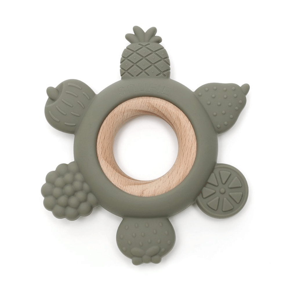De fruitige kleuren, verschillende structuren en vrolijke reliëfs maken de bijtring visueel én tactiel aantrekkelijk. Leuk om naar te kijken én op te kauwen!