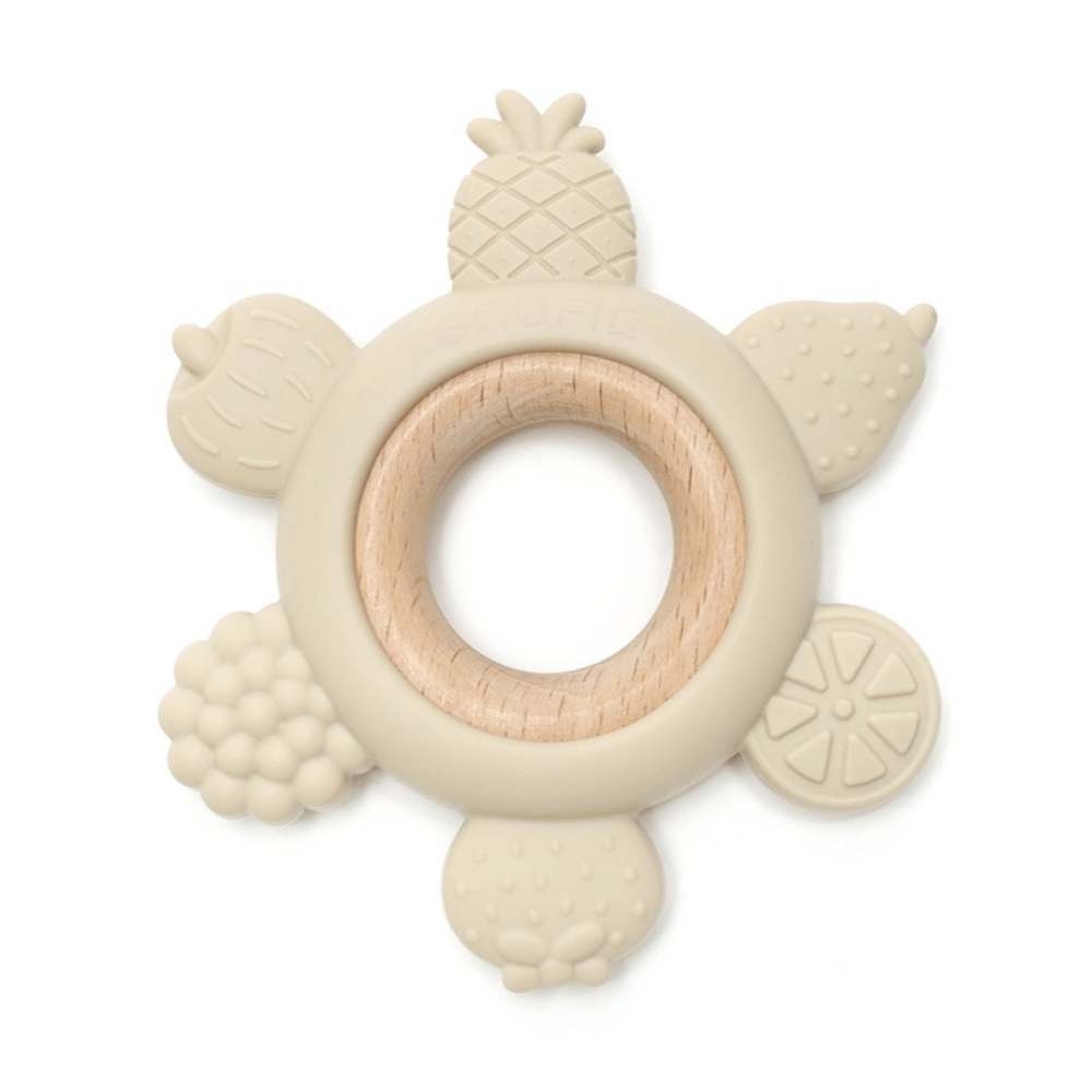 De fruitige kleuren, verschillende structuren en vrolijke reliëfs maken de bijtring visueel én tactiel aantrekkelijk. Leuk om naar te kijken én op te kauwen!