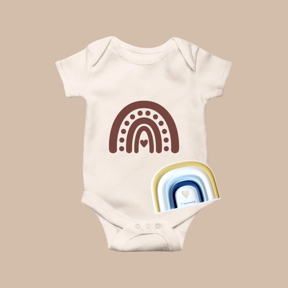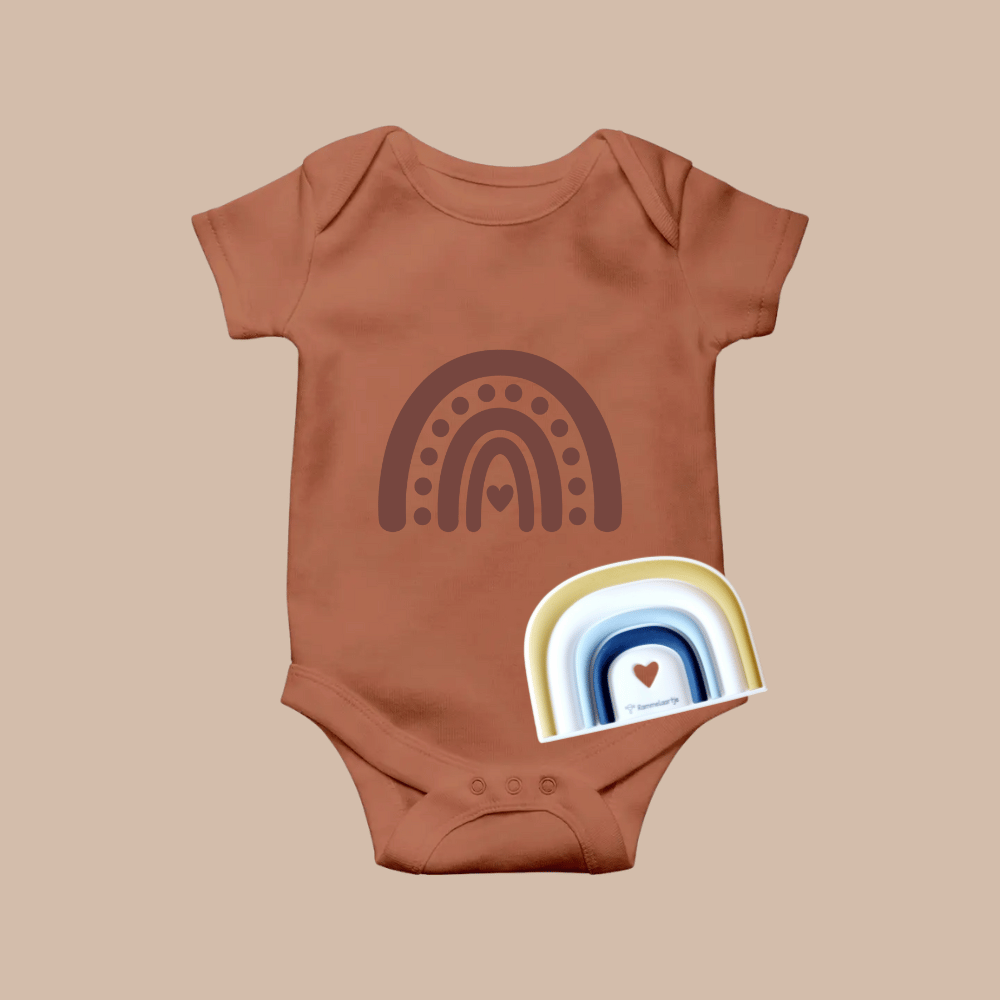 Deze set is ideaal als kraamcadeau of als eerste outfit mét speeltje voor je eigen baby. De warme, neutrale tinten maken hem tijdloos én stijlvol — klaar om te stralen in regenboogstijl!