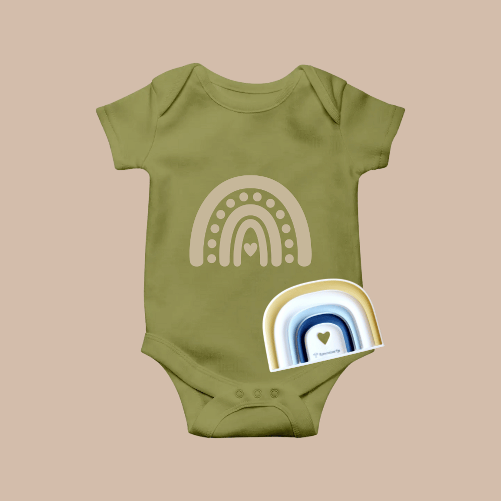 ✨ Een superzachte romper met een regenboogprint, verkrijgbaar in de prachtige kleuren zand, okergeel, clay en olijfgroen. De romper is gemaakt van comfortabel katoen en beschikbaar in de maten 0–3 maanden (maat 62) en 3–6 maanden (maat 68).