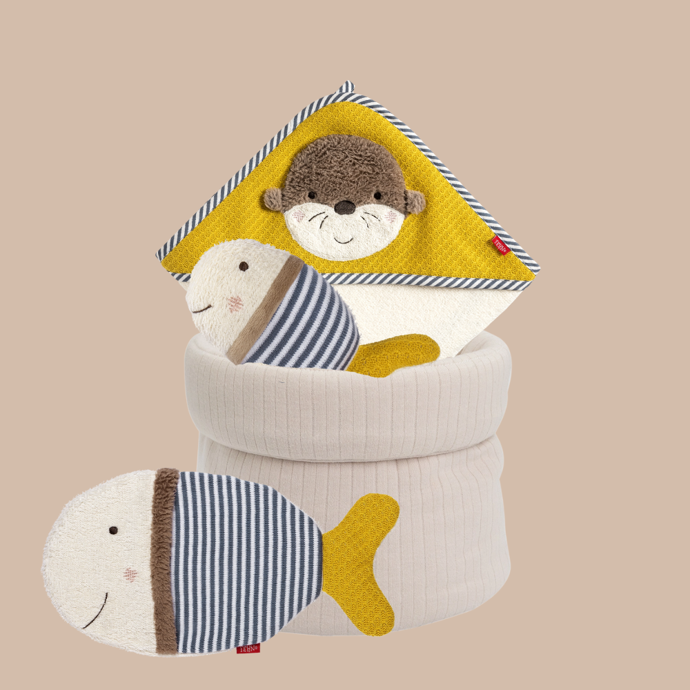 Deze complete Otter Theo badset maakt van elk badje een heerlijk verwenmoment! De set bevat drie perfect op elkaar afgestemde producten: een badhanddoek met capuchon, een speelse viswashand én een vrolijk badspeeltje in visvorm – en dat alles verpakt in een stijlvolle opbergmand van katoen. Perfect als kraamcadeau of babyshowergift!