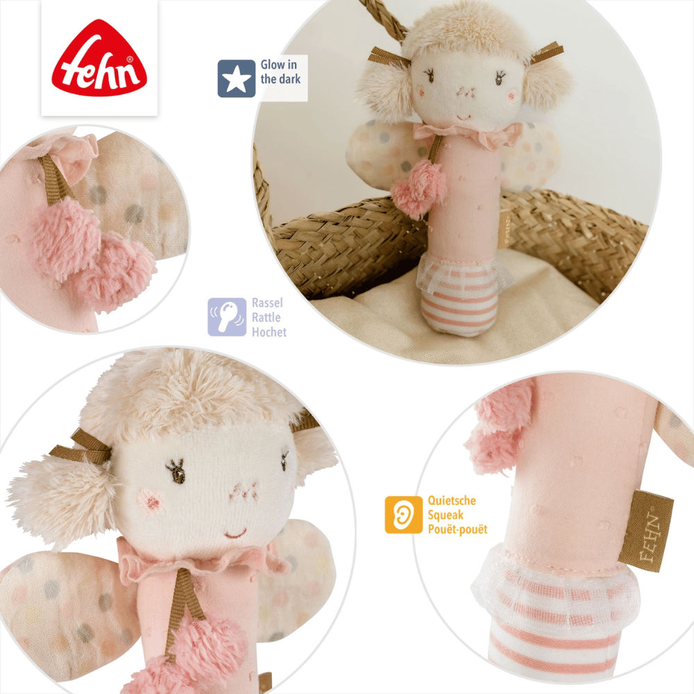 De grijper Fee uit de FeehnLand-collectie combineert betoverend design met speelse functies en wordt zo al snel het favoriete speeltje van je baby. De schattige fee nodigt uit om te grijpen, voelen, rammelen en piepen – en prikkelt daarmee de nieuwsgierigheid van kleine ontdekkers. Extra bijzonder: het fijne glow-in-the-dark borduursel licht zacht op in het donker en zorgt voor een geruststellende gloed tijdens het inslapen.