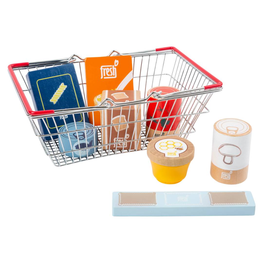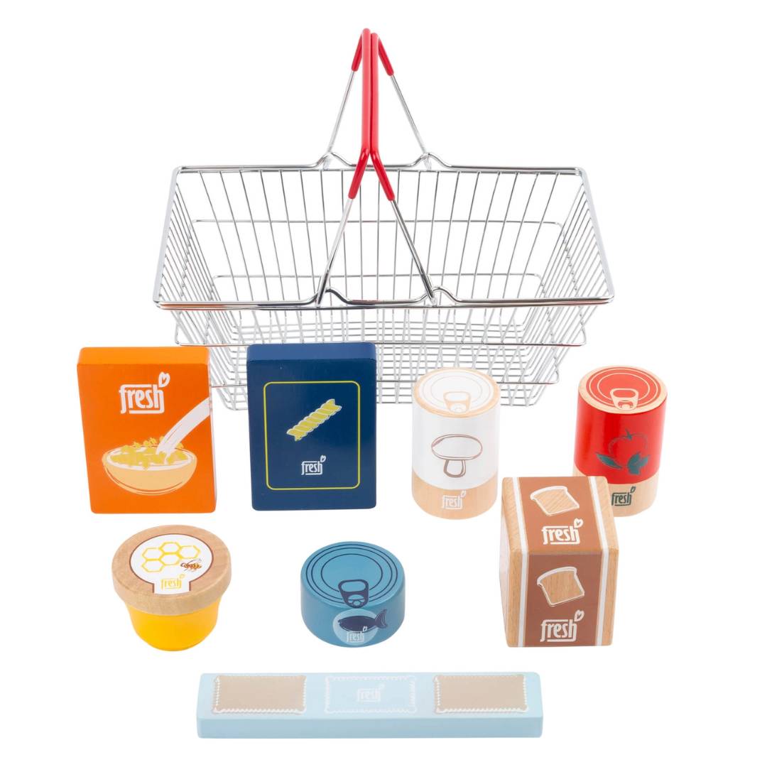 Met de bijgeleverde metalen boodschappenmand kunnen kinderen hun boodschappen verzamelen en meenemen, waardoor het rollenspel nog realistischer wordt. De set is ontworpen in typische productkleuren en heeft een hoog zichtbaar houtgehalte, wat zorgt voor een natuurlijke uitstraling en langdurig speelplezier.