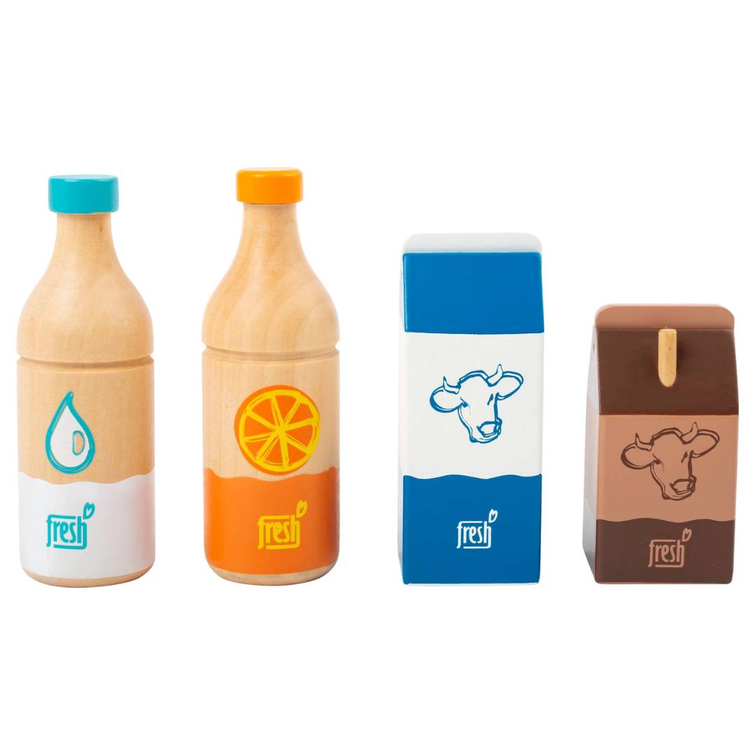 Vier dorstlessers in één handige set! Deze vierdelige houten drinkset bevat een fles sinaasappelsap, fles water, melkpak en klein drinkpakje cacao, perfect voor rollenspel in de kinderkeuken of winkel.