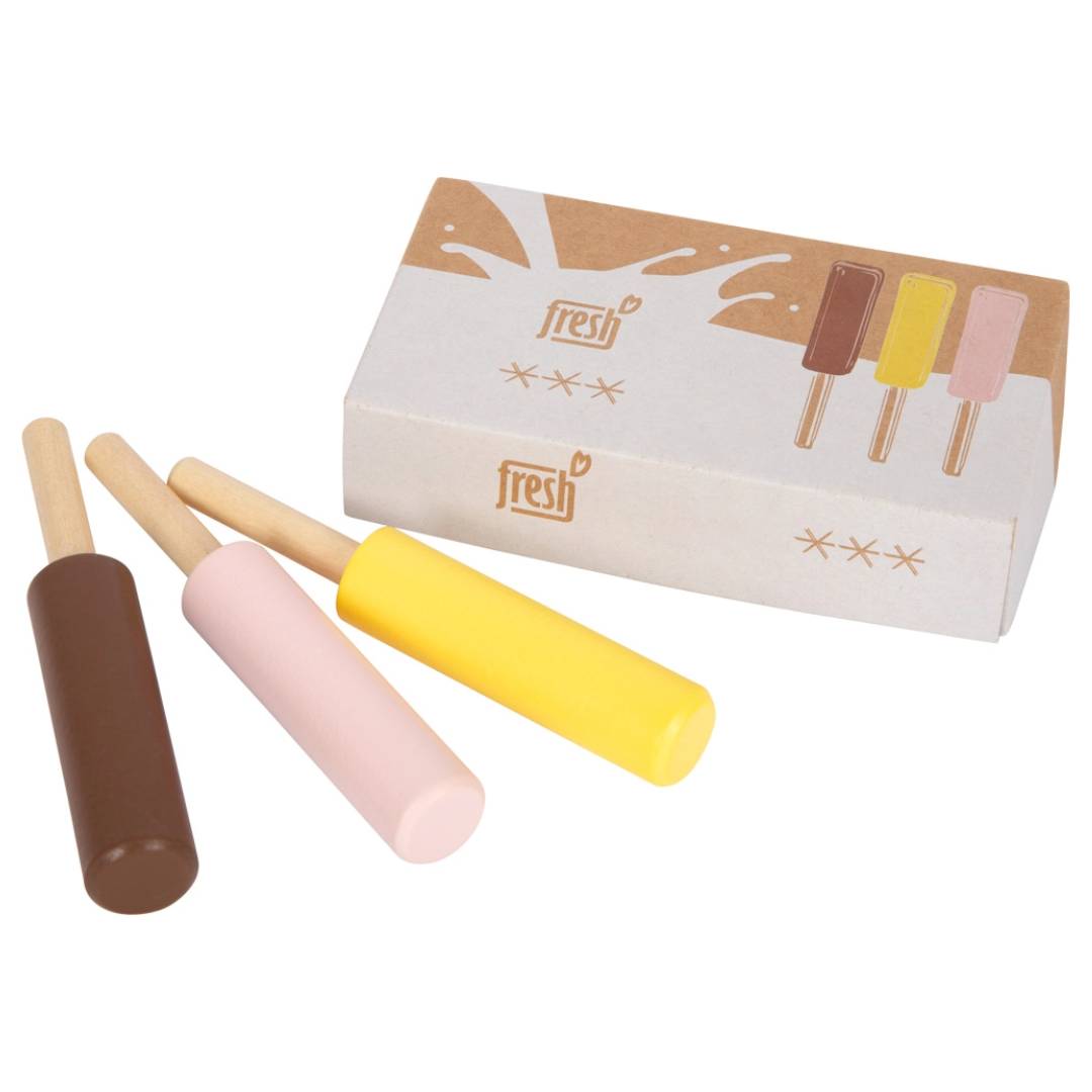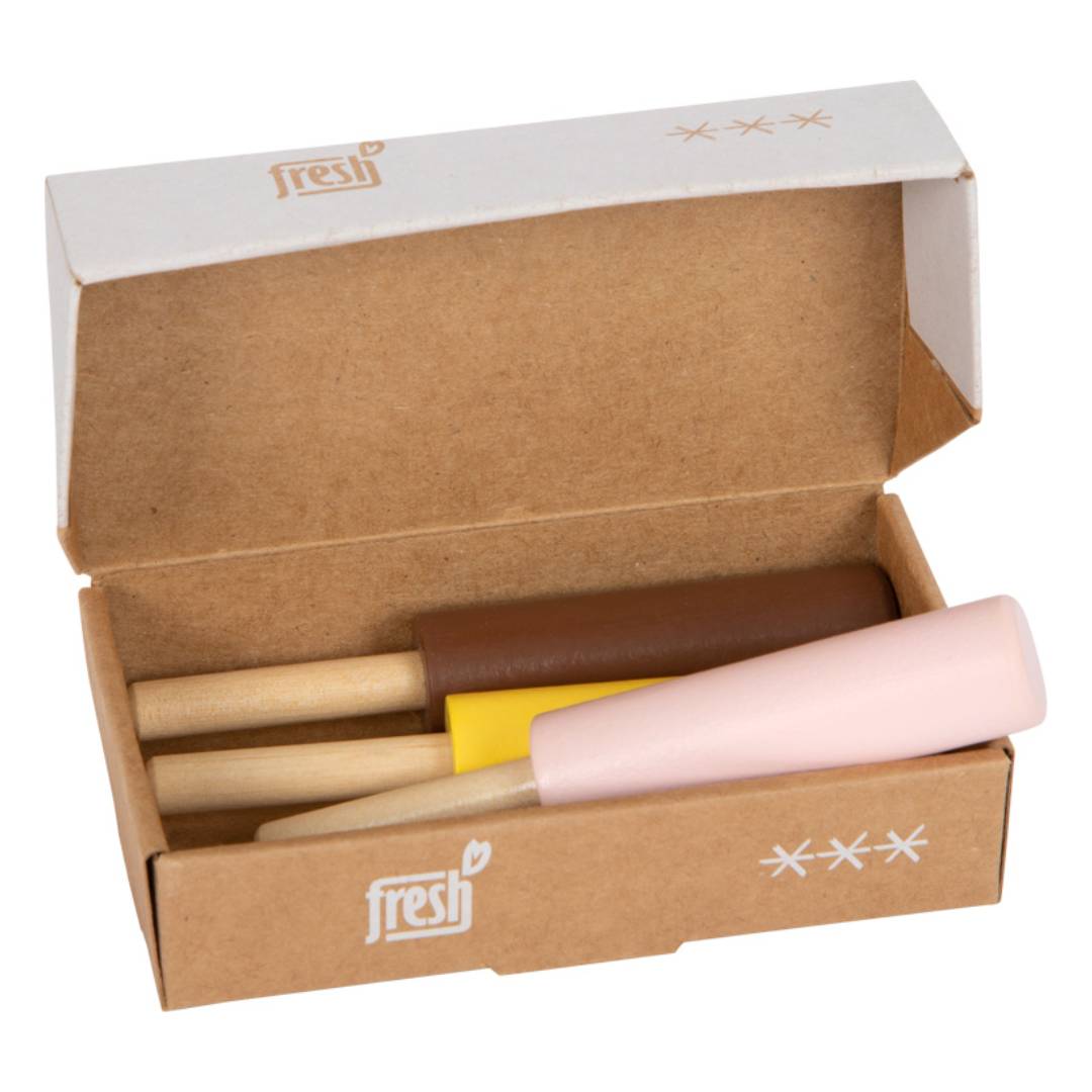 Tijd voor een ijsje! Met deze houten ijsjes set van 3 stuks wordt elke winkel of kinderkeuken een gezellige ijssalon. Het trio bevat ijslolly’s in aardbei-, vanille- en chocoladevariaties, perfect voor realistisch rollenspel en fantasierijk spelen.