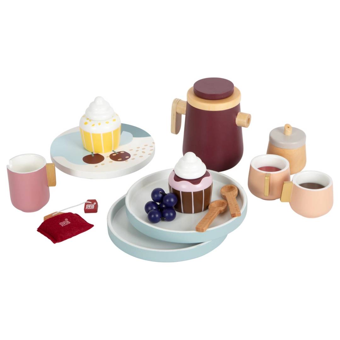 Scandinavisch design ontmoet fantasierijk speelplezier! Met dit houten koffie- en theeservies brengen kinderen een vleugje stijl en gezelligheid in hun kinderkeuken. De uitgebreide speelset voor twee personen bevat bekers, borden, koffielepels, suikerpot, melkkan en een elegante taartstandaard waarop alle lekkernijen gepresenteerd kunnen worden.