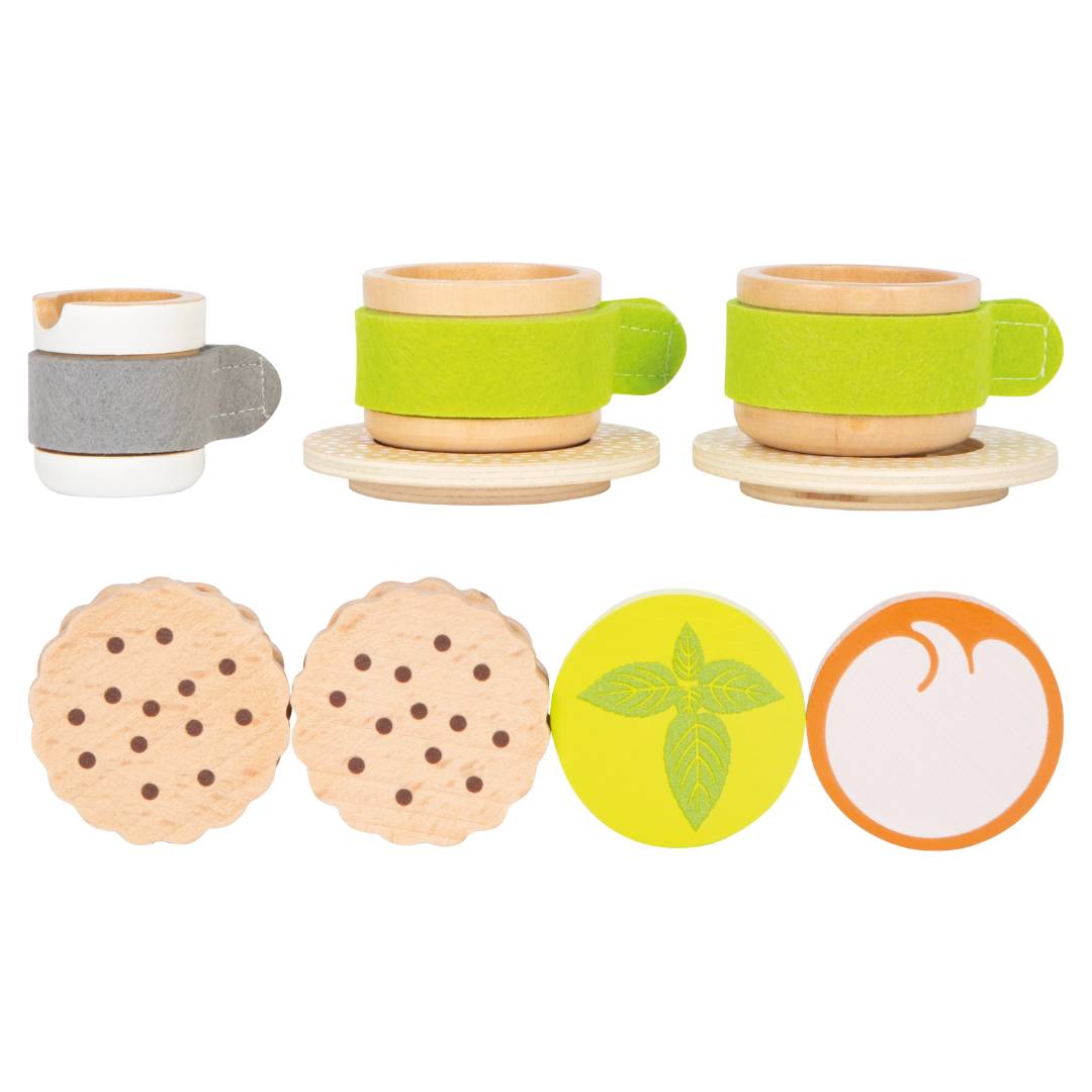 De afneembare deksels op de pot en suikerpot en de koffie- en theechips die in de kopjes geplaatst kunnen worden, zorgen voor een realistische spelervaring. Dankzij het gebruik van houten elementen gecombineerd met vilt heeft de set een natuurlijke uitstraling en een fijne haptiek.