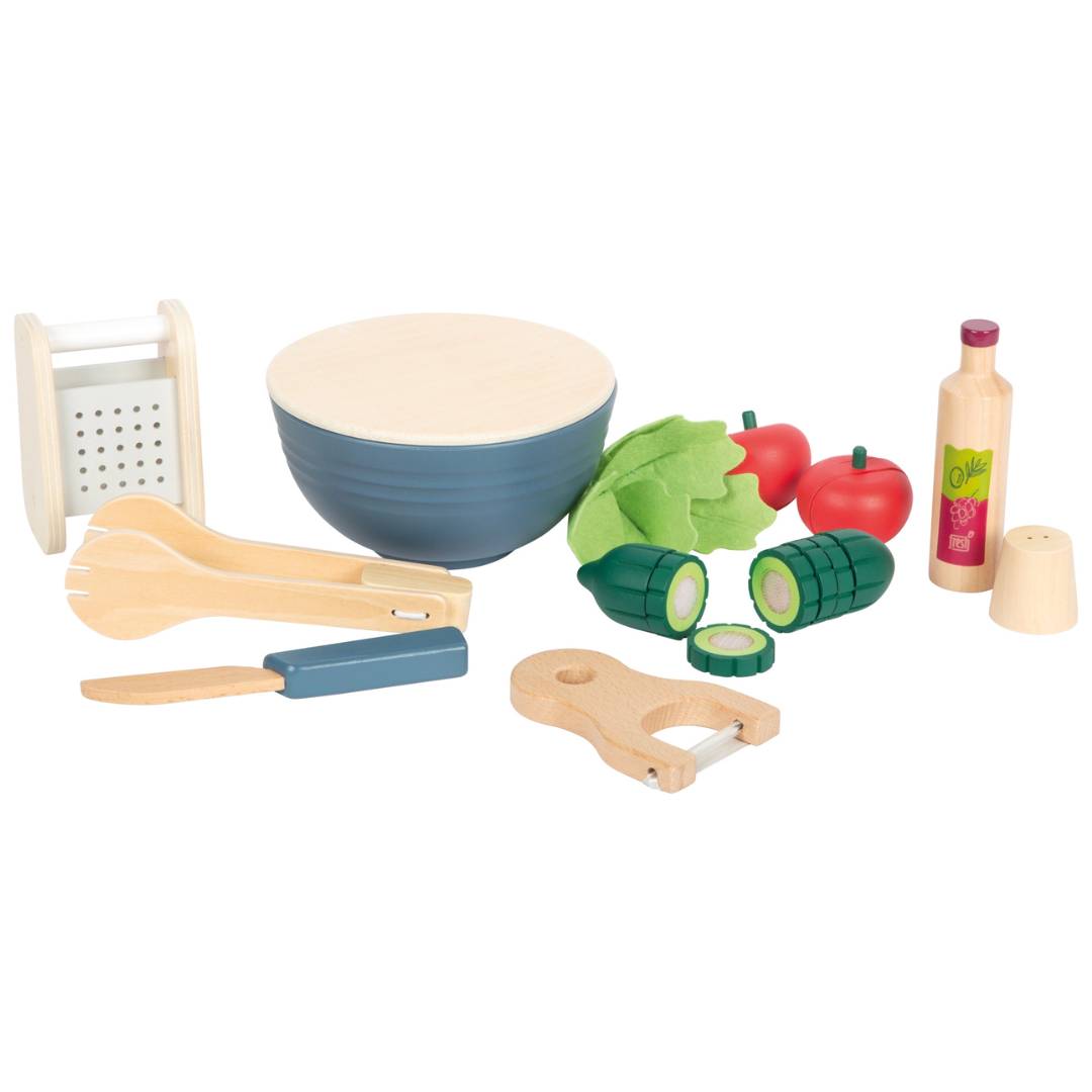 Kinderen kunnen zelf hun salade bereiden met de komkommer en twee tomaten, die door klittenband bij elkaar worden gehouden en eenvoudig kunnen worden gesneden met het houten groentemes. De groene vilten krop sla, waarvan de binnenblaadjes uitneembaar zijn, geeft een extra realistische ervaring.