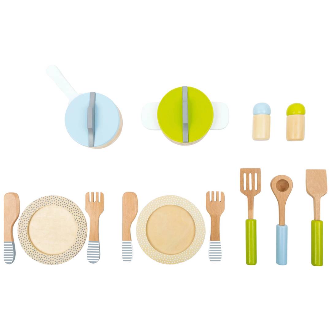 Chef-koks met Michelin-sterren, opgelet! Met deze houten servies- en pannenset wordt koken in de kinderkeuken een kleurrijk en fantasierijk avontuur. De set is gemaakt van stevig hout en bevat pannen met afneembare deksels, die gemakkelijk door kleine handjes vastgepakt kunnen worden.