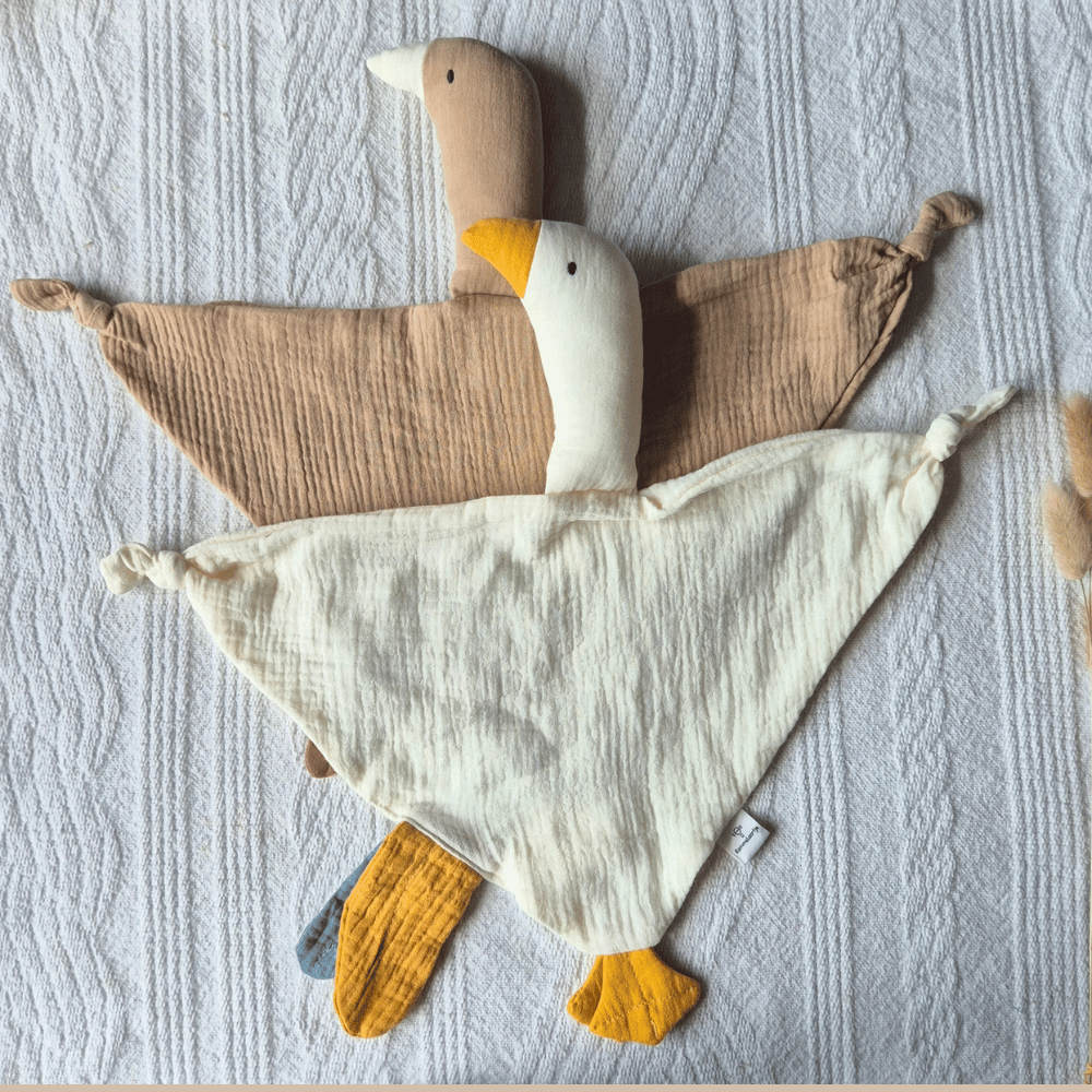 Laat je kleintje zich veilig en geborgen voelen met deze lieve knuffel in de vorm van een gans, verkrijgbaar in de stijlvolle kleuren bruin en wit. Deze zachte vriend is gemaakt van ademend, hydrofiel katoen – perfect voor de gevoelige huid van je baby.