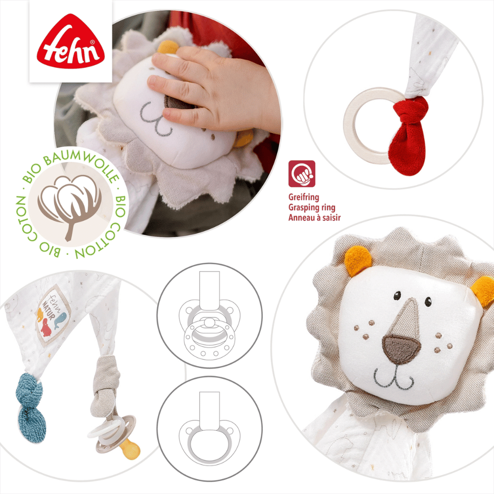 Bij het inslapen zorgt de zachte knuffelleeuw voor een gevoel van geborgenheid en rust. Overdag nodigen de verschillende texturen en de houten grijpring uit tot ontdekken, grijpen en knuffelen – een echte stimulans voor de zintuigen van je kleintje. Dankzij de praktische bevestigingsring raak je de fopspeen niet kwijt tijdens grote avonturen.