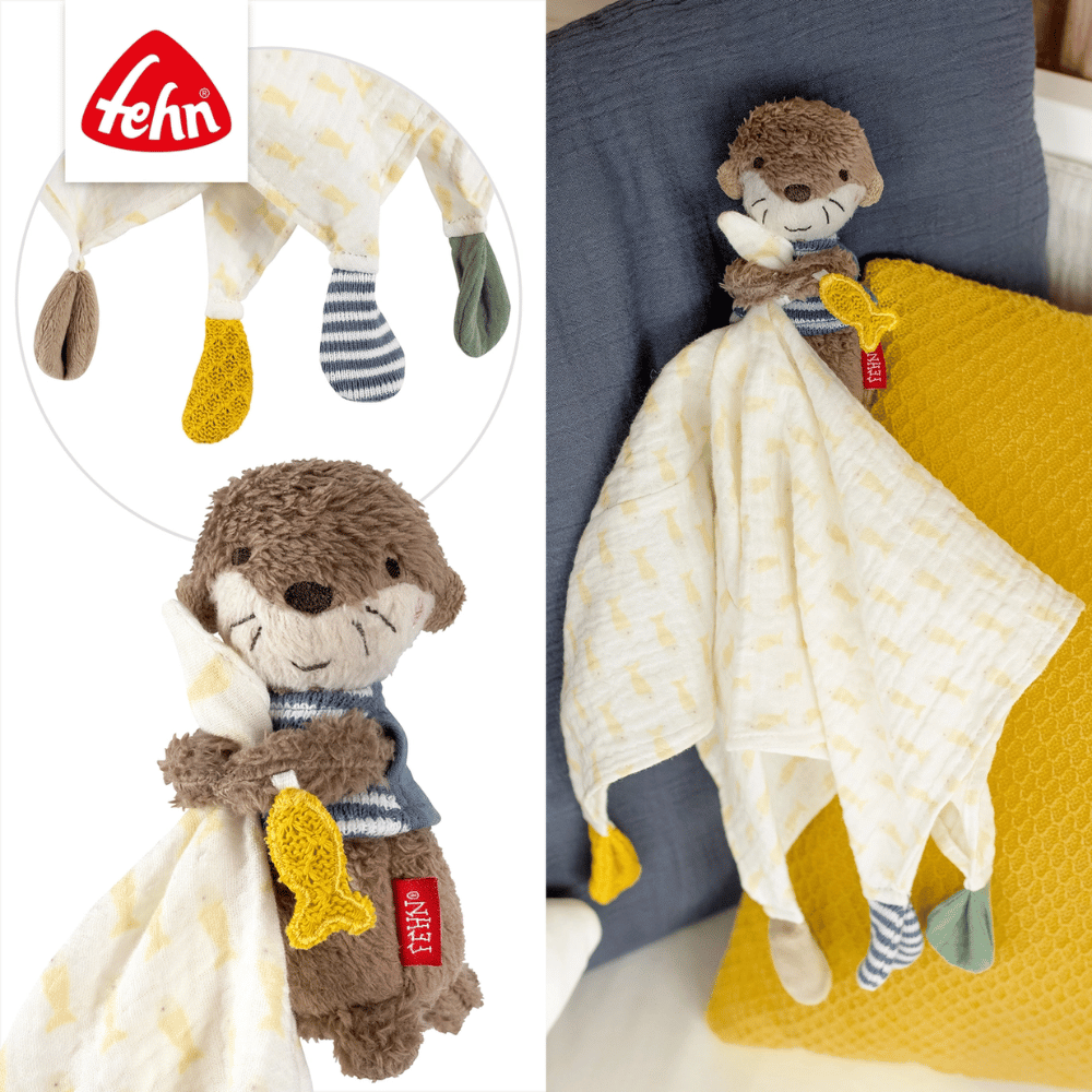 De luchtige mousseline doek van katoen geeft een gevoel van veiligheid en geborgenheid tijdens het inslapen, terwijl de knuffelzachte materialen, het otterfiguurtje en de speels gestikte uiteinden uitnodigen tot grijpen, voelen en knuffelen.