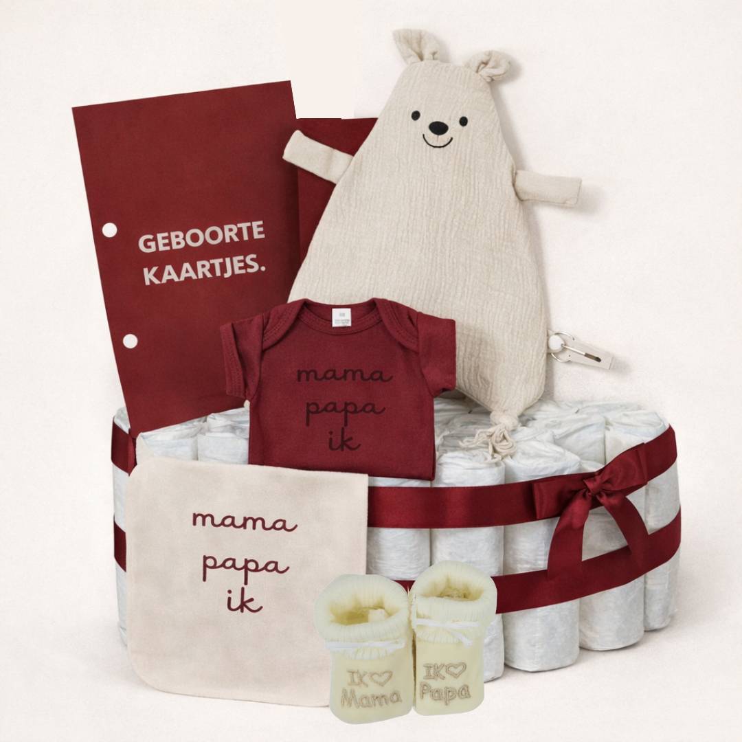 Met warme bordeaux- en zandtinten, zachte materialen en praktische items is deze luiertaart perfect om kersverse ouders te feliciteren bij de geboorte van hun kindje. Een cadeau dat zowel mooi oogt als écht van pas komt.