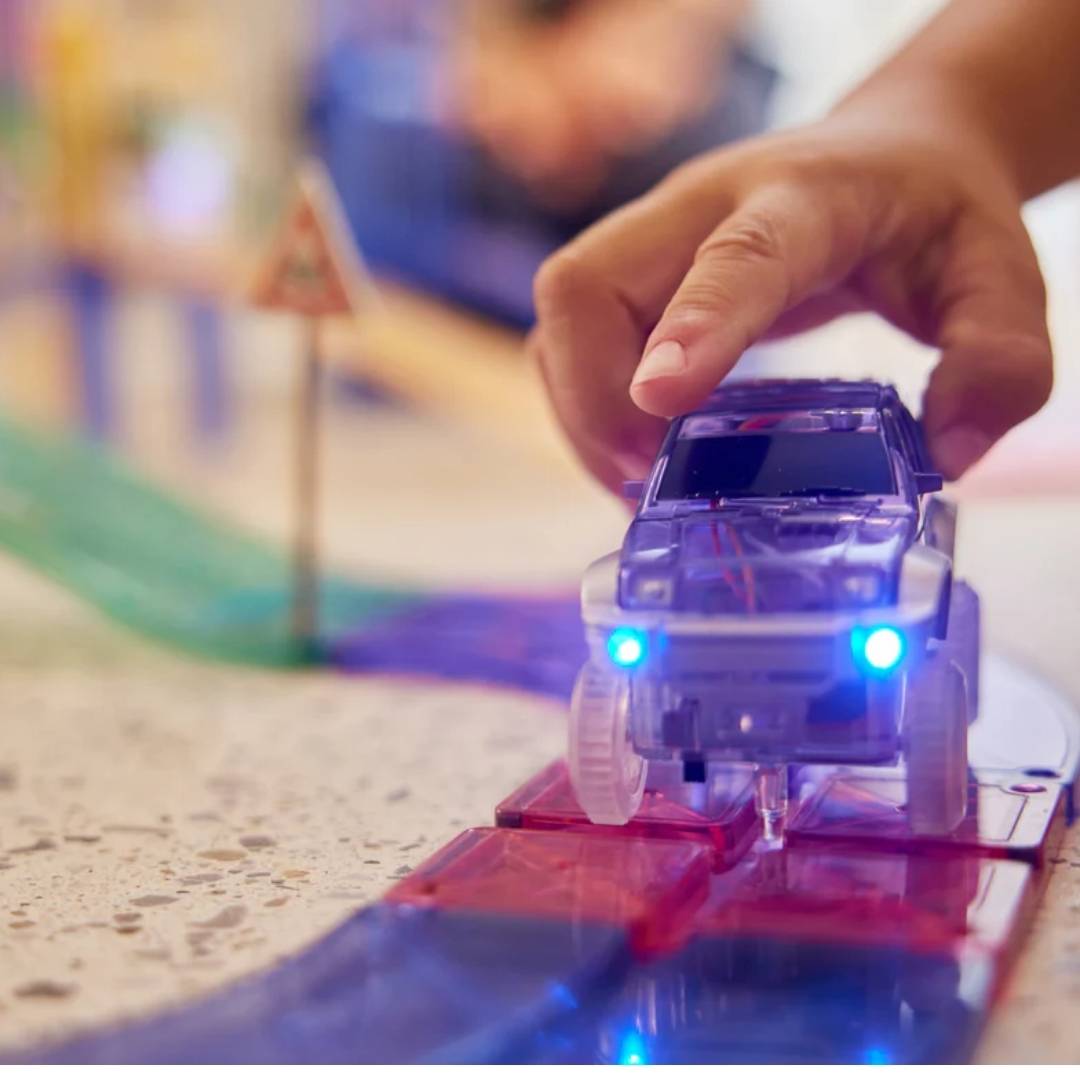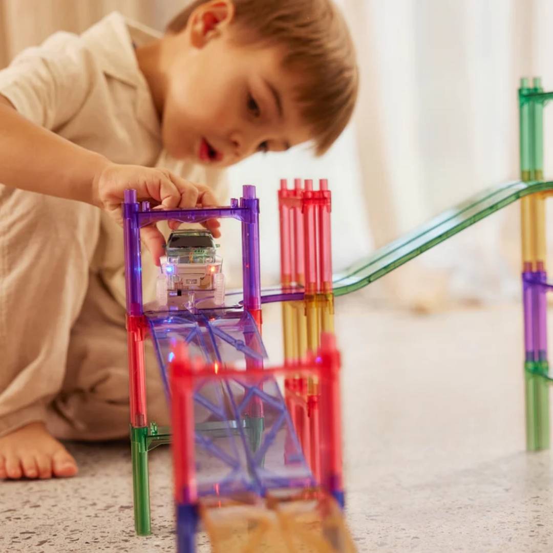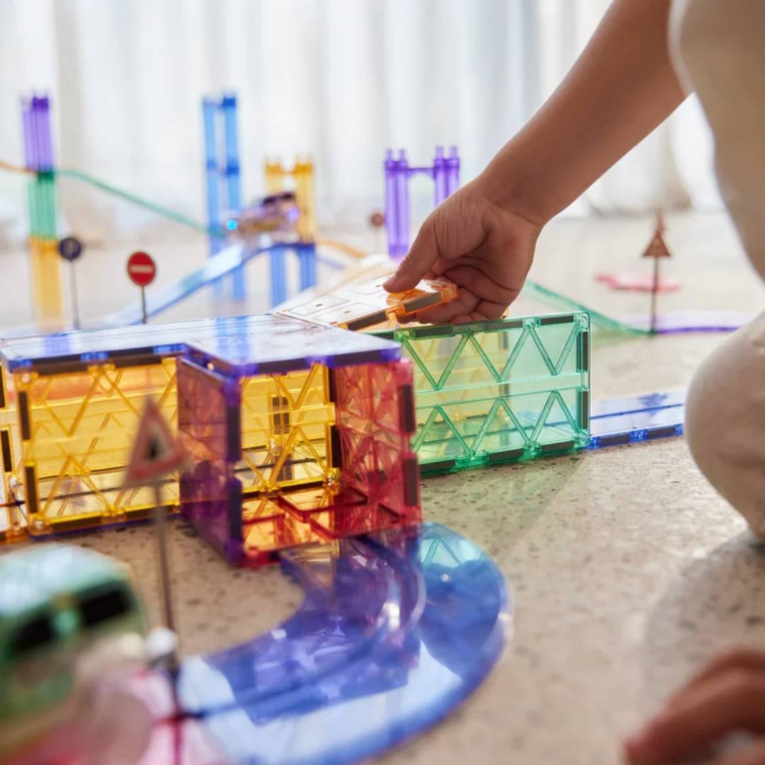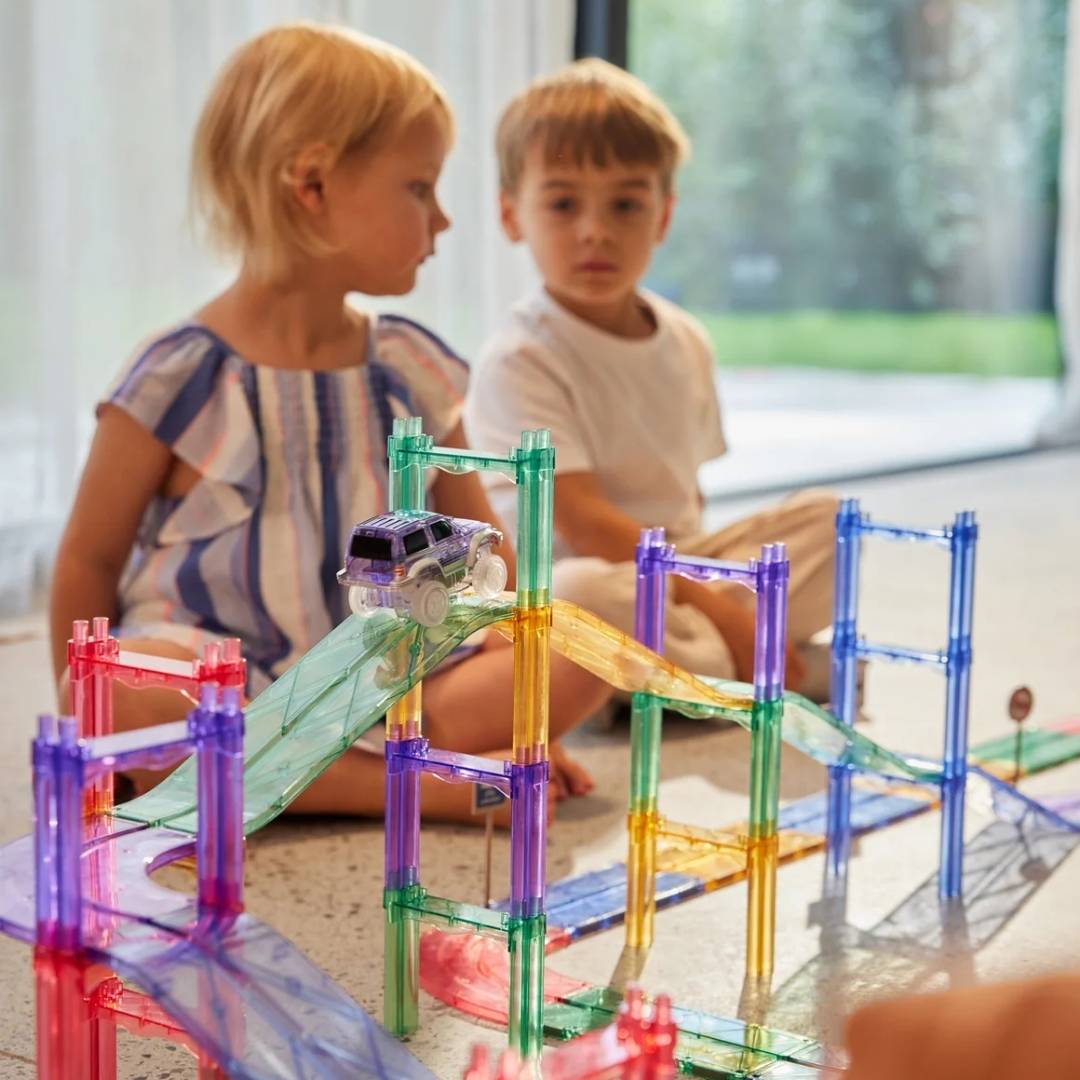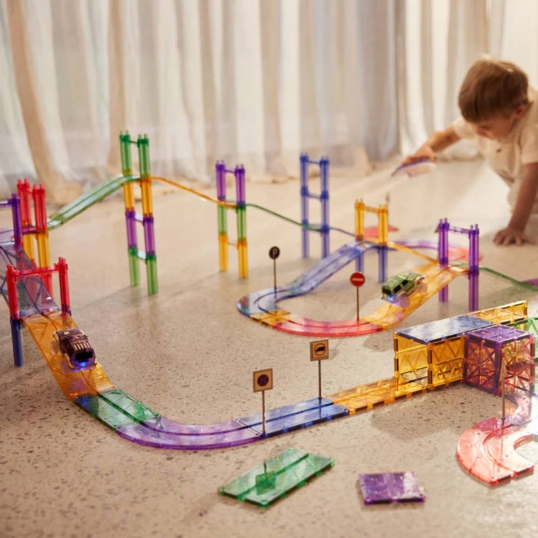 De set bevat verkeersborden, pilaren en twee autootjes om het speelplezier nog realistischer en leuker te maken. Zo kunnen kinderen niet alleen bouwen, maar ook actief racen en hun eigen verkeersregels bedenken! Perfect om de motoriek, probleemoplossend denken en fantasie te stimuleren.