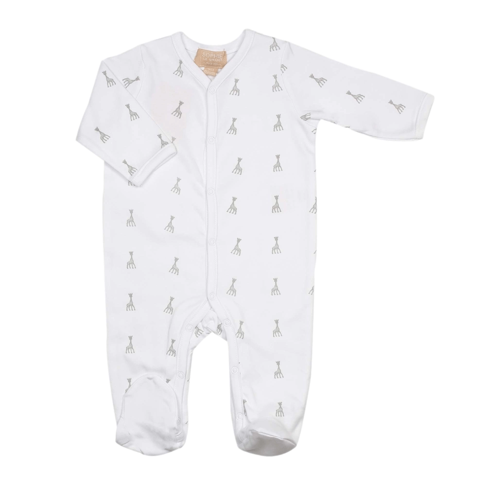 Sophie de Giraf Pyjama – Comfortabele katoenen pyjama met lange mouwen en voetjes, ideaal voor warme, veilige nachten.