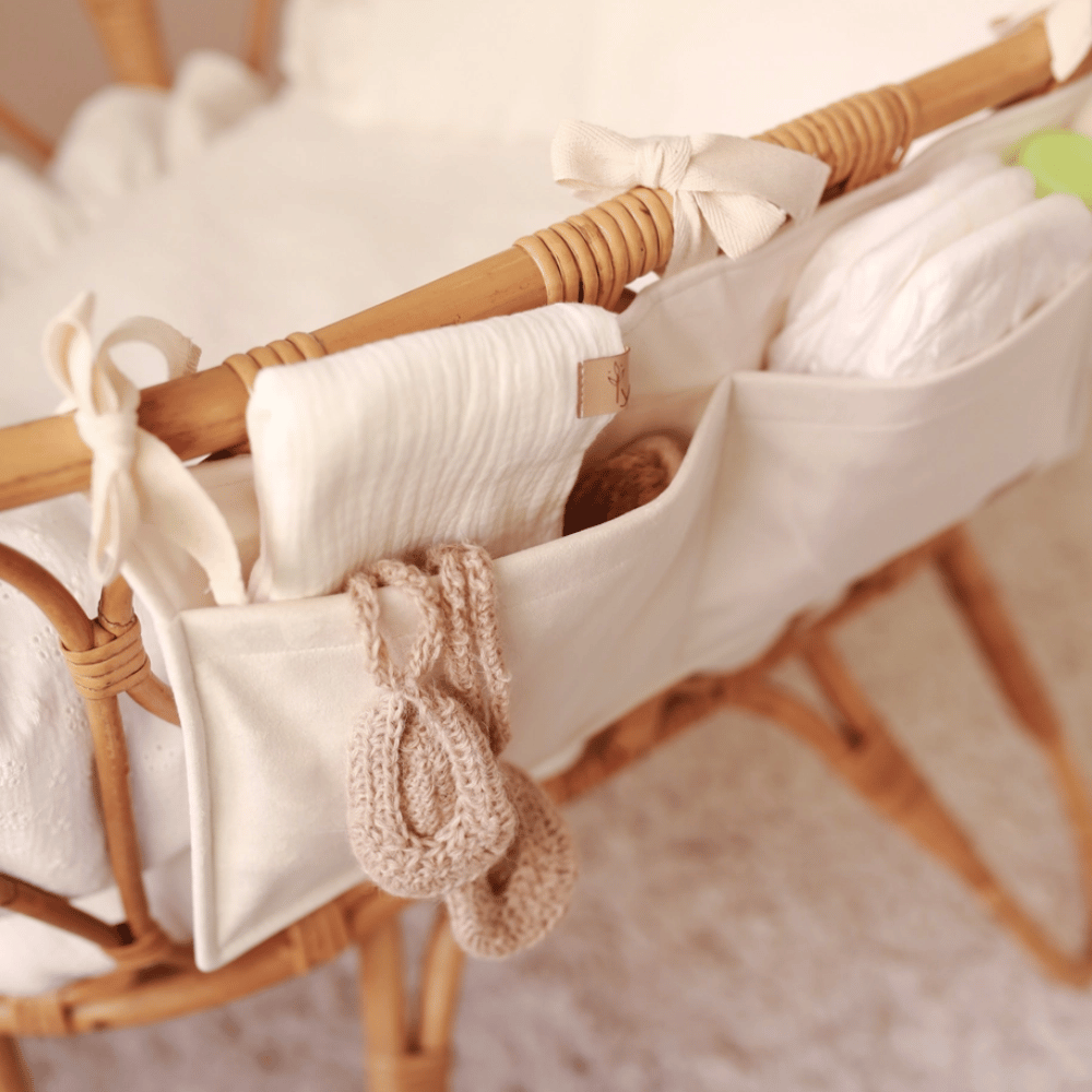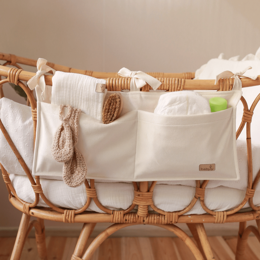De organizer kan eenvoudig worden opgehangen aan een ledikant, bed of zelfs aan een radiator, en is daarmee een praktische aanvulling op elke babykamer of verzorgingsplek. Ook perfect om op de commode te plaatsen.