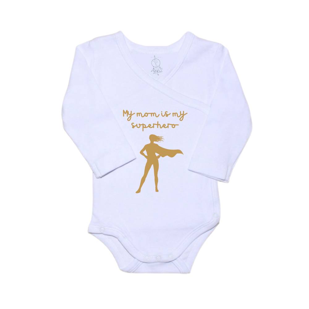 Dit comfortabele, witte overslagrompertje met een mooie opdruk en tekst ‘my mom is my superhero’ uit de SuperFam collectie is perfect voor de allerkleinsten. Ideaal als kraamcadeau of om je eigen baby iets bijzonders aan te trekken.
