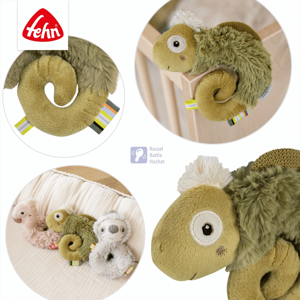 De ringrammelaar Kameleon uit de Kameleon-, Luiaard- en Flamingo-collectie is het perfecte eerste speelgoed voor nieuwsgierige babyhandjes! Met zijn zachte materialen, boeiende vormen en geïntegreerde rammelaar stimuleert hij op een speelse manier de tastzin, het grijpvermogen en het gehoor van je kleintje.