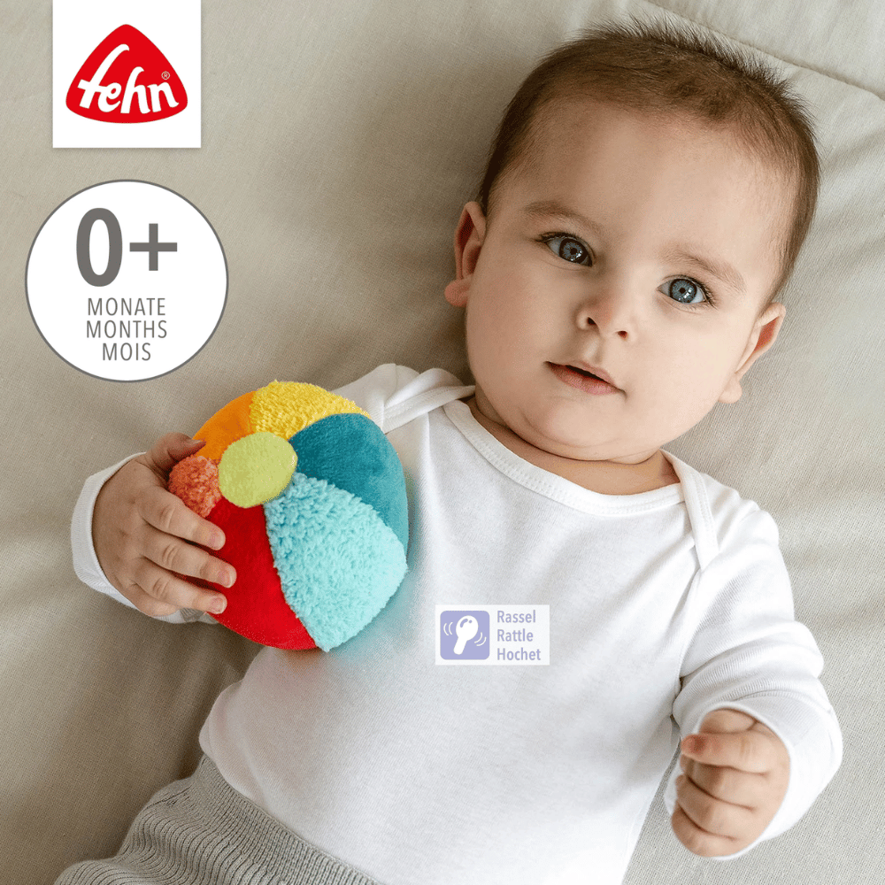 Wanneer de bal beweegt, laat de ingebouwde rammelaar een vrolijk geluid horen dat de aandacht van je kindje trekt en uitnodigt om te volgen, grijpen en spelen. De zachte materialen – een spannende mix van velours, bouclette en badstof – prikkelen het tastgevoel en zorgen voor een aangename grip.