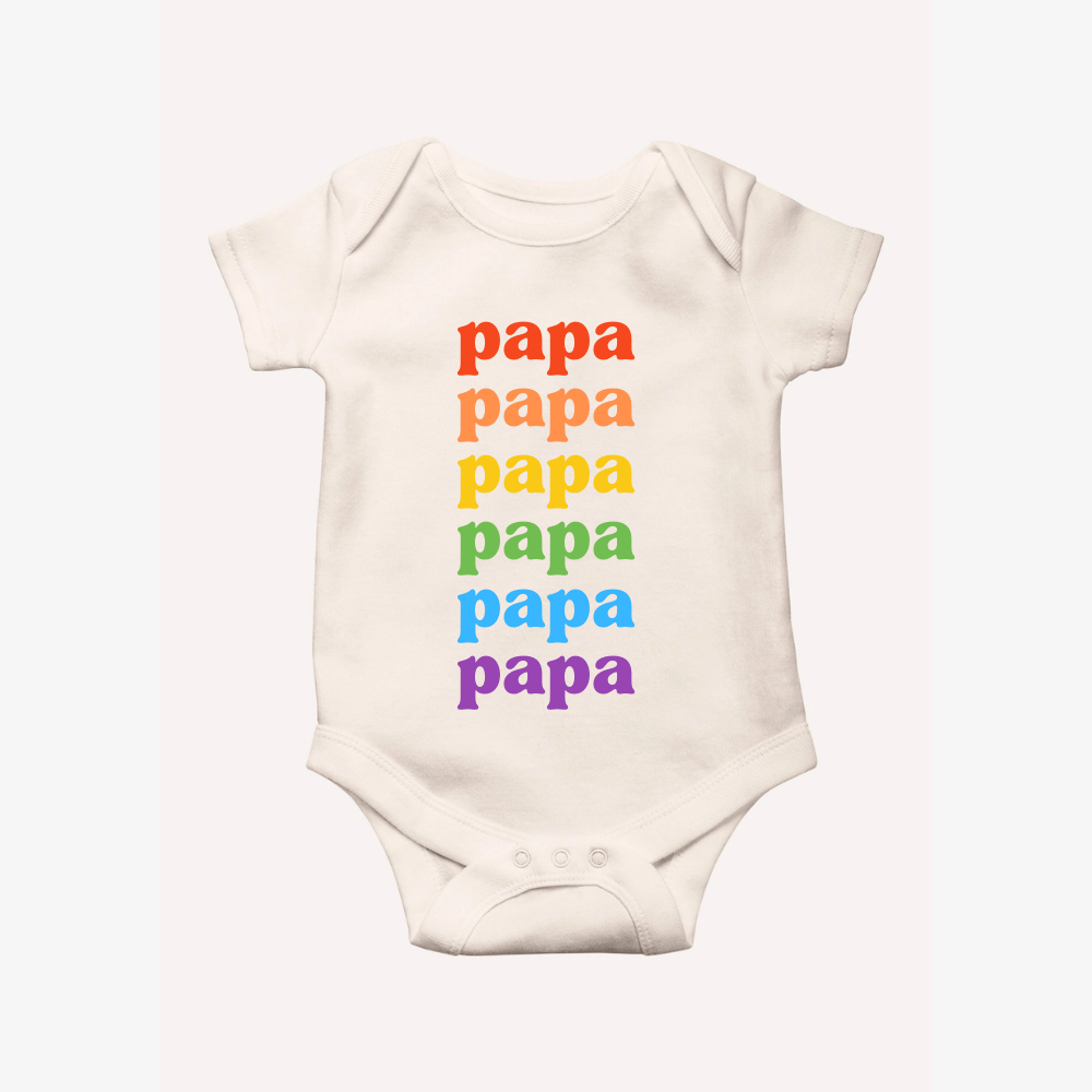 Op zoek naar een uniek en veilig rompertje voor je kleintje of als origineel kraamcadeau? Dit zachte rompertje met een mooie opdruk van ‘papa’ in regenboogkleuren is niet alleen comfortabel, maar ook een echte eyecatcher!