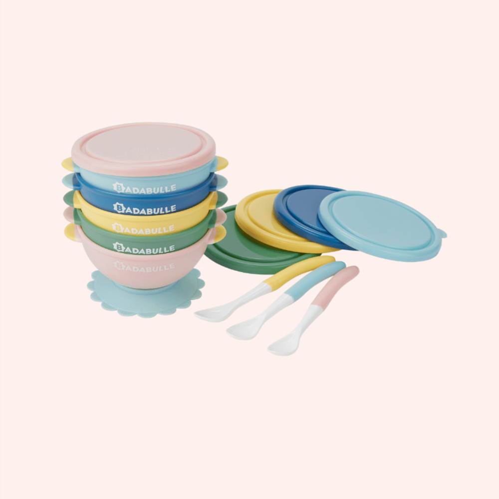 Met deze set van 5 antislipkommetjes (330 ml) en 3 zachte babylepels in zachte pastelkleuren ben jij helemaal voorbereid op de eerste hapjes tot de dagelijkse maaltijden.