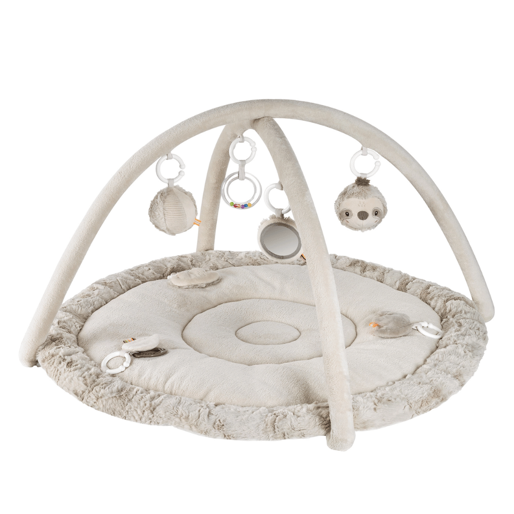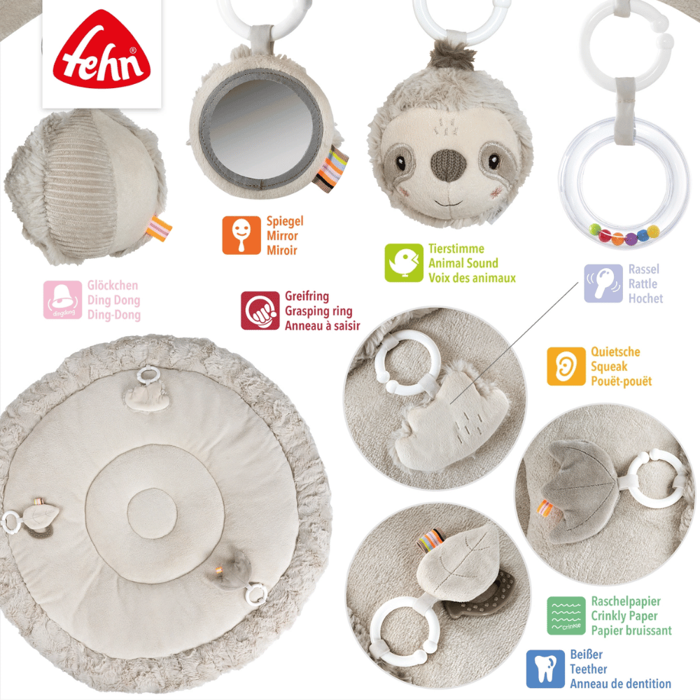 Op het kleed zelf bevinden zich drie afneembare speeltjes met knisperpapier, pieper en rammelaar, die helpen bij het ontwikkelen van de tastzin en hand-oogcoördinatie. Aan de twee speelbogen, die makkelijk op te zetten zijn, hangen een ringrammelaar, een zachte bal met verborgen belletje, een spiegel en een luiaard met dierengeluid – perfect voor extra speelplezier en sensorische prikkels.