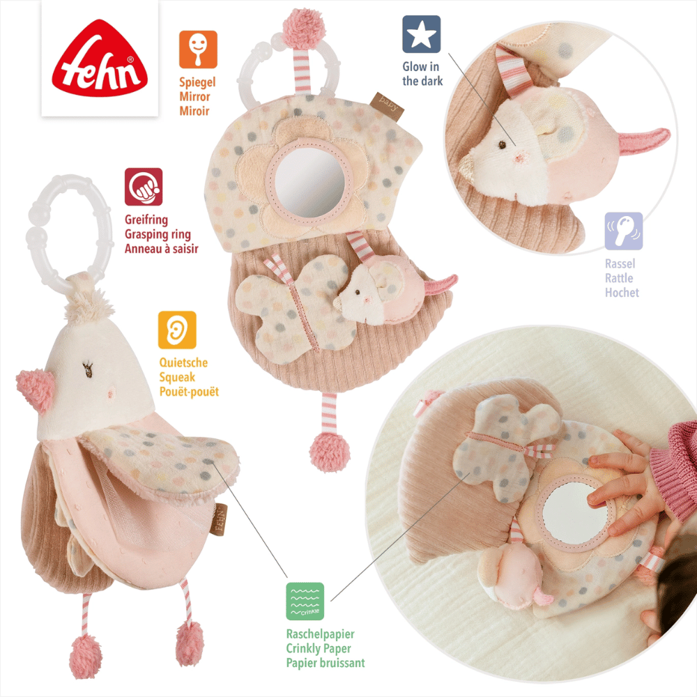 Het zachte stoffen voelboekje vogel uit de Fehn-collectie stimuleert baby’s om te ontdekken, te voelen en te grijpen. De schattige vogel verbergt twee verrassingen onder zijn vleugels: een rammelende muis en een vlinder van ritselend papier. Een kleine spiegel wekt de nieuwsgierigheid van de baby en draagt bij aan de ontwikkeling van het zelfbewustzijn.